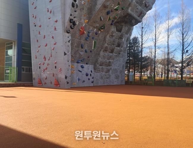 (원투원뉴스) 원주시는 이용자 안전 확보와 쾌적한 체육활동 환경 조성을 위해 종합운동장 내 인공암벽장 바닥을 전면 보수했다.