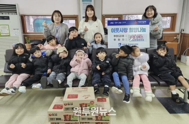 (원투원뉴스) 수원시 권선구 서둔동은 지난 23일, 서둔동에 위치한 향기나무어린이집에서 원아들이 소중한 마음을 모아 라면 5박스를 서둔동 행정복지센터에 기부했다고 밝혔다.