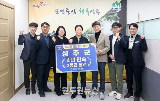 (원투원뉴스) 성주군은 국민권익위원회 주관 ‘2025년 공공기관 종합청렴도 평가’에서 2등급을 받아 4년 연속 종합청렴도 2등급을 달성했다.