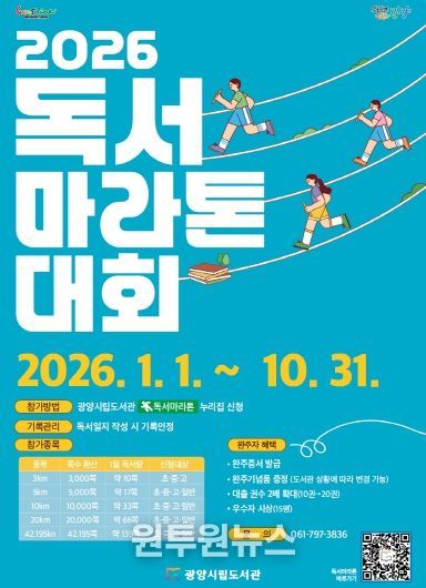 (원투원뉴스) 광양시립도서관이 지역사회에 독서문화 확산을 위해 2026년 1월 1일부터 10월 31일까지 ‘2026 광양시 독서마라톤 대회’를 운영한다.