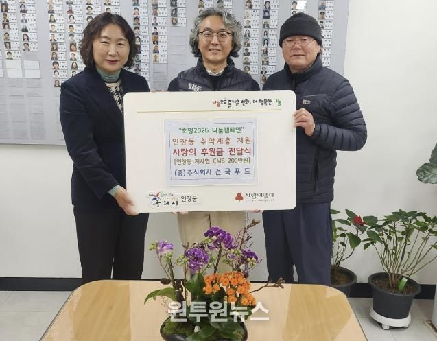 (원투원뉴스) 구리시 인창동 행정복지센터는 지난 12월 23일 인창동에 소재한 ㈜건국푸드로부터 취약계층 지원을 위한 후원금 200만 원을 지정 기탁받았다고 밝혔다.