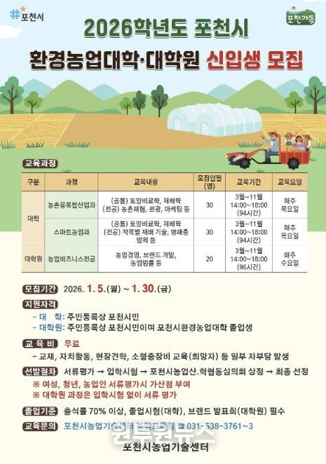 (원투원뉴스) 포천시는 2026년 1월 5일부터 30일까지 ‘2026학년도 포천시 환경농업대학 및 대학원’ 신입생을 모집한다.