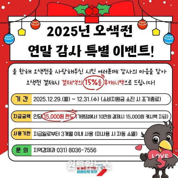 (원투원뉴스) 오산시는 한 해 동안 지역화폐를 이용해 준 시민들에게 감사의 뜻을 전하고, 연말 소비 활성화를 도모하기 위해 ‘2025년 오색전 연말 감사 특별 이벤트’를 추진한다.