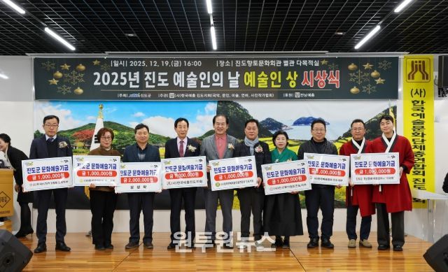 지역 예술인과 예술단체는 지난 19일에 열린 ‘2025년 진도 예술인의 날’ 행사에서 한 해를 마무리하며 문화진흥기금을 조성하는 데 뜻을 모았다.
