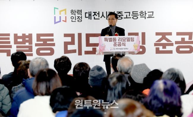 (원투원뉴스) 대전시의회 조원휘 의장은 24일 대전시립중고등학교 특별동 리모델링 공사 준공식에 참석해 준공을 축하하며, 배움을 향한 만학도들의 꿈과 용기를 응원했다.