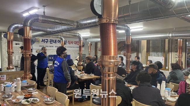(원투원뉴스) (사)바르게살기운동 서구협의회(회장 백창욱)는 지난 23일 연말을 맞아 지역 내 어르신 130명을 초청해 ‘어르신 특식데이’행사를 성황리에 개최했다. 이번 행사는 어르신들의 건강과 복지 증진을 위해 마련됐으며, 이날 행사에 참여한 어르신들은 든든한 식사와 함께 이웃과 정겨운 담소를 나누며 뜻깊은 시간을 보냈다.