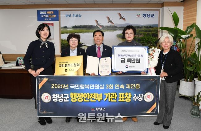 (원투원뉴스) 창녕군은 정부세종청사에서 열린 ‘2025년 민원행정발전 유공 시상식’에서 국민행복민원실 인증 분야 행정안전부 장관 기관 표창을 수상했다.
