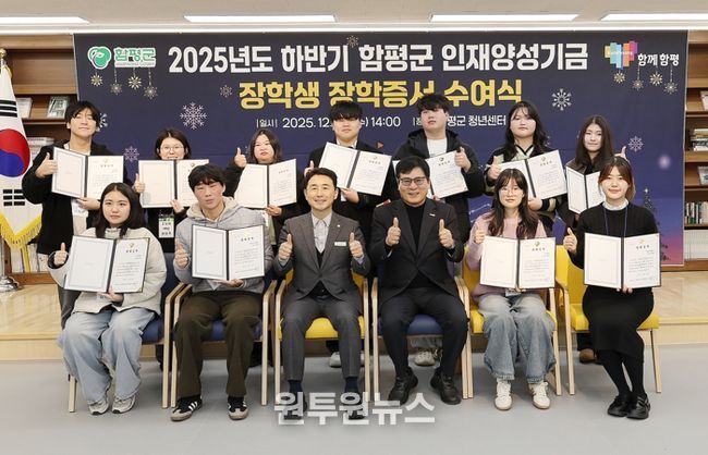 함평군은 25일 “‘2025년 하반기 함평군 인재양성기금 장학생 장학증서 수여식’이 지난 24일 함평군 청년센터에서 개최됐다”고 밝혔다.