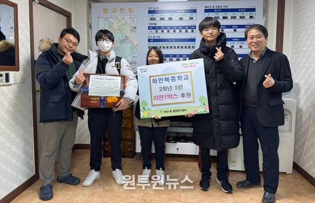 (원투원뉴스) 광명시 하안북중학교 2학년 5반 학생들은 지난 24일 연말을 맞아 지역 내 어려운 이웃을 돕기 위해 ‘학생 1인 1라면 기부’ 활동으로 모은 라면 1박스를 하안1동 지역사회보장협의체에 전달했다.