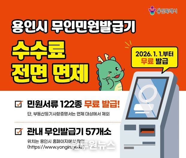 (원투원뉴스) 용인특례시는 2026년 1월 1일부터 지역 내 설치된 무인민원발급기에서 발급되는 민원서류 수수료를 전면 면제한다고 25일 밝혔다.