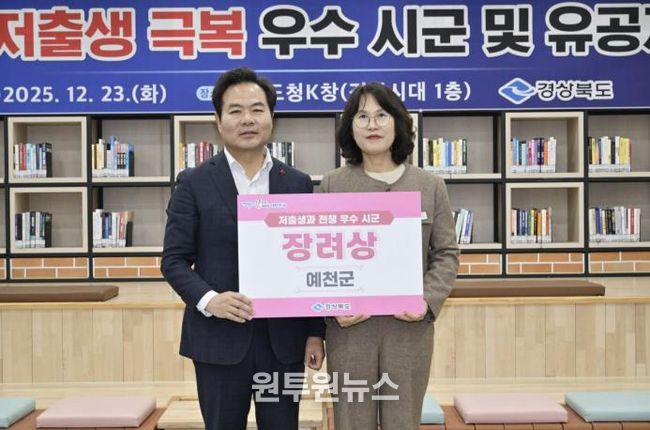 (원투원뉴스) 예천군은 지난 23일, 경북도청에서 열린 ‘2025 경상북도 저출생 극복 우수 시군 평가’ 시상식에서 장려상을 수상하며 2년 연속 수상의 쾌거를 달성했다.