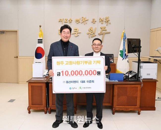(원투원뉴스) ㈜동산이엔지 이준희 회장은 지난 24일 원주시청을 방문해 고향사랑기부금 1천만 원을 기탁하며 따뜻한 나눔을 실천했다.