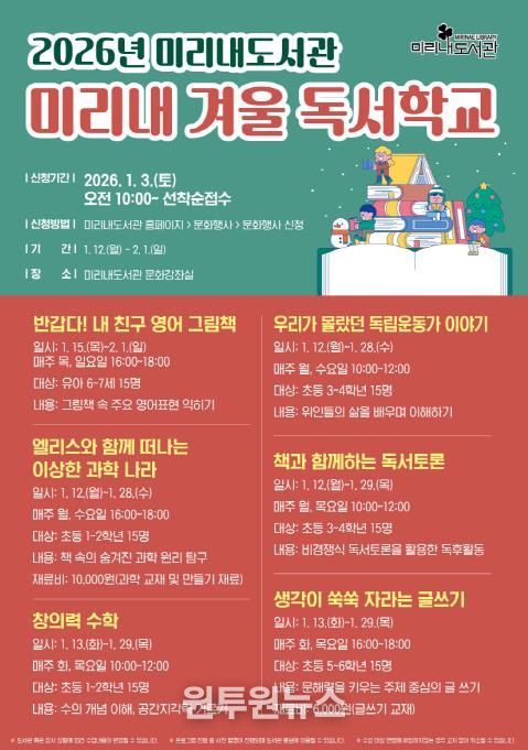 (원투원뉴스) 원주시 미리내도서관은 오는 1월 유아와 어린이를 대상으로 ‘미리내 겨울 독서학교’를 운영한다.