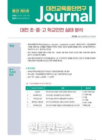 (원투원뉴스) 대전교육과학연구원 대전교육정책연구소는 2025년 대전교육종단연구저널 제5호'대전 초·중·고 학교안전 실태 분석', 제6호 '대전 교육가족의 정신건강 현황 분석'을 발간하여 대전 모든 기관 및 전국 교육정책연구소에 안내하고, 대전교육과학연구원 누리집에 공개했다고 밝혔다.