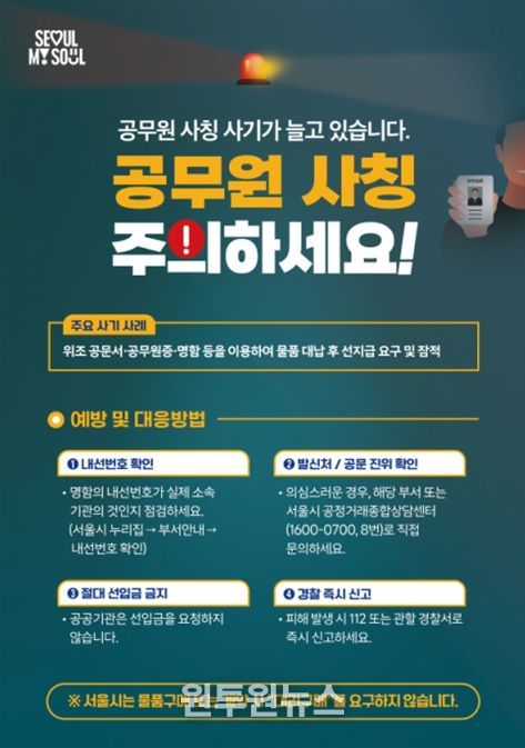 (원투원뉴스) 서울시는 최근 중·소상공인을 대상으로 공무원 사칭 사기 피해가 끊이지 않고 발생하고 있어, 서울시공정거래종합상담센터 내 ‘공무원 사칭 사기 피해 신고센터’를 설치하고 적극 대응에 나선다.