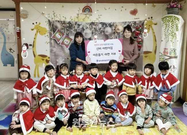 (원투원뉴스) 수원시 장안구 정자3동은 지난 24일 신비어린이집 원아들이 크리스마스를 앞두고 정자3동 행정복지센터를 찾아 라면 26박스를 전달했다고 밝혔다.