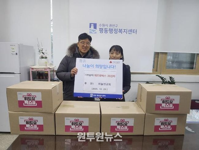 (원투원뉴스) 수원시 권선구 고색동 소재 하늘성교회는 지난 23일 성탄절을 맞이하여 '위드유박스' 21박스를 평동 행정복지센터에 전달했다.