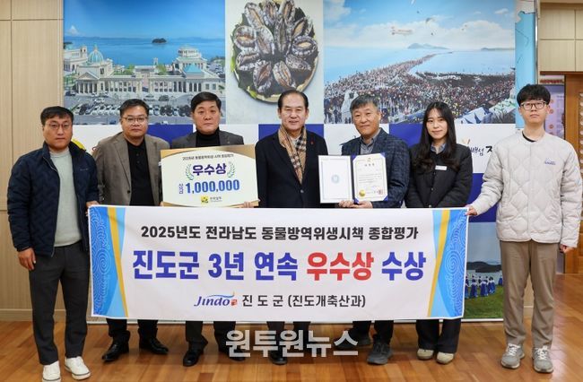 (원투원뉴스) 진도군은 전라남도에서 주관한 ‘2025년 동물방역위생시책 종합평가’에서 우수상을 받으며, 3년 연속 우수 지방자치단체로 선정됐다.
