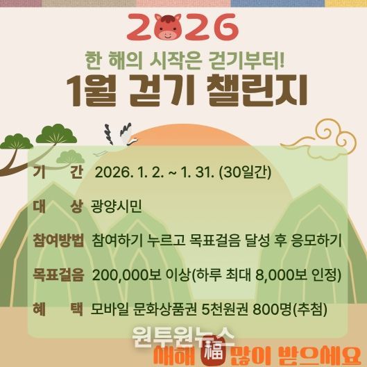 (원투원뉴스) 광양시는 지역 주민의 건강생활실천을 지원하기 위해 모바일 걷기 앱 '워크온'에서 ‘한 해의 시작은 걷기부터! 1월 걷기 챌린지’를 운영한다고 밝혔다.