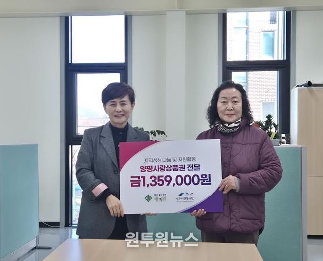 (원투원뉴스) 재단법인 세미원은 지난 22일 최근 관람객이 기부한 양평사랑상품권 총 135만 9천 원을 양수리전통시장상인회에 기부했다고 밝혔다.