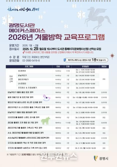(원투원뉴스) 광명시 광명도서관은 오는 29일부터 ‘메이커스페이스 2026년 겨울방학 교육 프로그램’ 참가자를 모집한다.