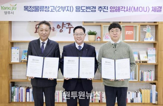(원투원뉴스) 양주시가 26일 시청 시장실에서 옥정물류창고 2부지 사업 취소와 용도변경 추진을 위한 양해각서를 체결했다.