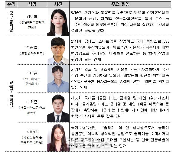 시상식에서는 최교진 교육부 장관이 수상자 100명에게 직접 상을 수여하며 이들을 축하·격려할 예정이다. 또한 대표 수상소감 발표, 특별강연 등 대한민국 인재들의 자부심과 책임감을 고취할 수 있는 기회도 제공한다.