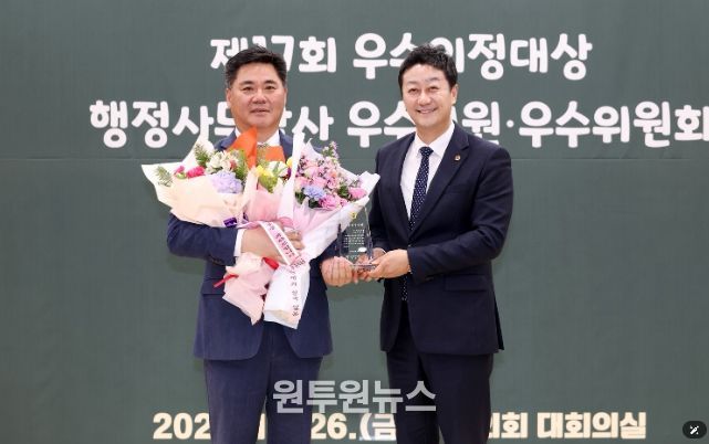 (원투원뉴스) 경기도의회 경제노동위원회 정하용 의원(국민의힘, 용인5)이 26일 열린 2025년 경기도의회 의원 종무식 및 시상식에서 대한민국시도의회의장협의회가 주관하는 ‘제17회 우수의정대상’ 및 경기도의회가 주관하는 ‘2025년 행정사무감사 우수의원’을 동시에 수상하는 영예를 안았다.