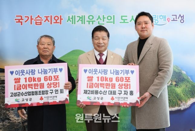 (원투원뉴스) 고성군 수산업협동조합 구언회 조합장과 제2비룡수산 대표 구자홍은 12월 26일 고성군을 방문하여 관내 경로당 지원을 위한 이웃사랑 나눔기부 쌀(10kg 120포) 400만 원 상당을 기탁하여 주위에 훈훈함을 선사했다.