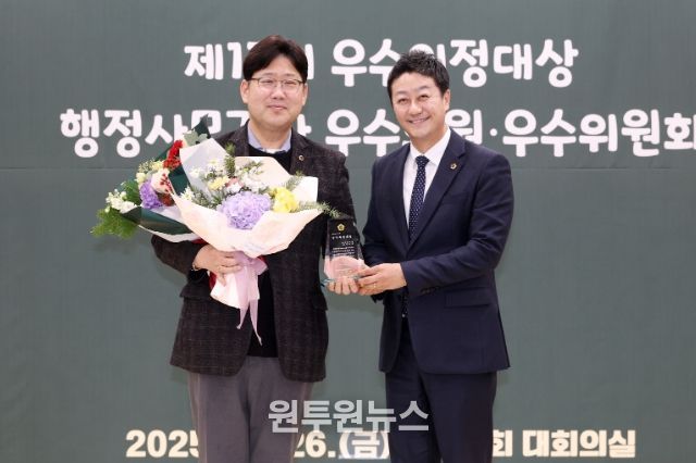 '우수의정대상'은 대한민국시도의회의장협의회가 매년 전국 광역의회의원을 대상으로, 주민참여 확대, 조례 제정, 지역현안 해결, 의정발전 기여도 등을 종합 평가해 시상하는 권위 있는 상이며, 김 의원은 2025년 한 해 동안 예산 감시, 공공기관 운영 점검, 도민 생활 밀착형 정책 제안 등 전방위 의정활동의 성과를 높이 평가받은 결과로 알려졌다.