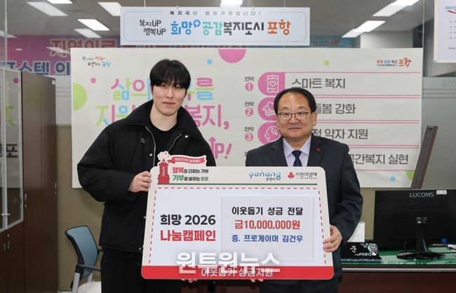 (원투원뉴스) 프로게이머 제카(Zeka)로 활동 중인 김건우 선수가 희망2026 나눔캠페인의 일환으로 성금 1천만 원을 포항시에 기탁했다.