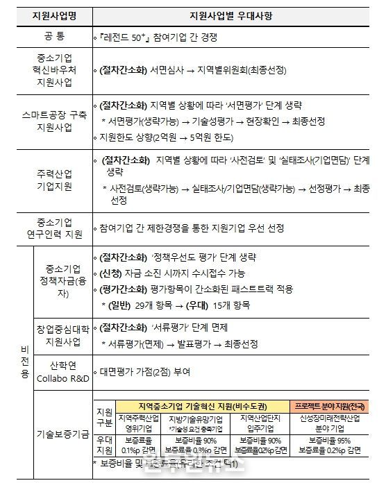 또한 정책자금, 창업·성장, R&D, 보증 분야에는 선정 절차 간소화, 평가 면제 또는 가점 부여, 지원한도 상향, 보증조건 우대 등 현장의 의견을 반영한 다양한 제도개선 사항이 적용된다.