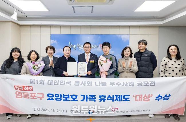 (원투원뉴스) 영등포구가 행정안전부 주최 2025년 제1회 대한민국 봉사와 나눔 우수사례 공모전에서 ‘요양보호가족 휴식제도’로 ‘행정안전부 장관상(대상)’을 수상했다고 밝혔다. 공공부문 자치구 가운데 유일한 수상으로, 지역 기반 돌봄 정책의 우수성을 전국적으로 인정받았다.