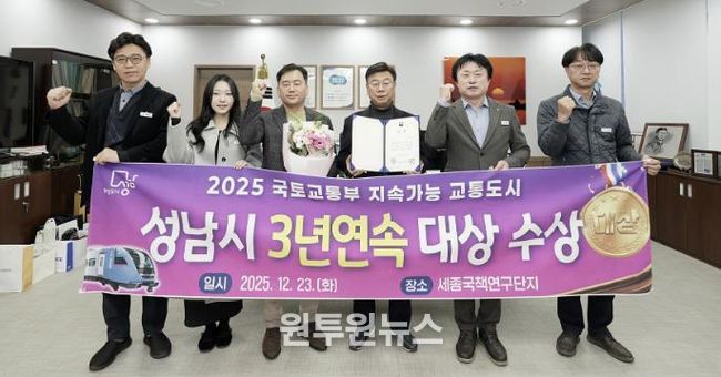 (원투원뉴스) 성남시가 국토교통부 주관 ‘2025 지속가능 교통도시 평가’에서 대상을 수상하며 3년 연속 최고 평가를 받았다. 2023년과 2024년에 이어 올해까지 연속 수상을 이어가며, 친환경 교통 정책과 대중교통 중심 도시 전략의 성과를 다시 한번 입증했다.