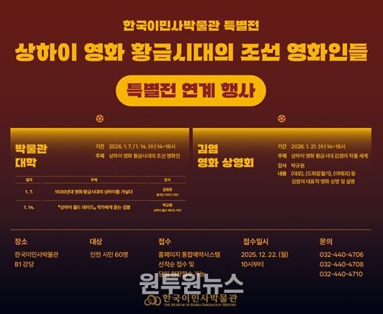 (원투원뉴스) 인천광역시 시립박물관 분관 한국이민사박물관은 특별전 〈상하이 영화 황금시대의 조선 영화인들〉과 연계해 유명 작가 초청 특강을 개최한다고 밝혔다.