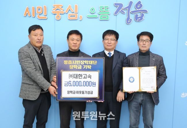 먼저 정읍시의 시내버스 운행을 책임지고 있는 ㈜대한고속(대표이사 이호진)은 이날 장학금 300만원을 쾌척했다.