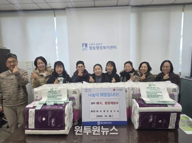 (원투원뉴스) 수원시 권선구 평동 통장협의회는 주민들과 함께 수거한 종이팩으로 교환받은 휴지와 종량제봉투를 전량 기부하며 따뜻한 나눔을 실천했다.