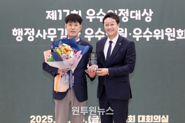 (원투원뉴스) 경기도의회 건설교통위원회 양운석 의원(더불어민주당, 안성1)이 지난 26일 경기도의회 대회의실에서 개최된 대한민국시도의회 의장협의회 주관 ‘제17회 우수의정대상’ 시상식에서 우수의정대상을 수상했다. 이번 수상은 입법, 예산 심사, 행정 감시 등 지방의회의 핵심 기능을 균형 있게 수행하며 도민 삶의 질 개선에 기여한 점이 종합적으로 평가된 결과다.
