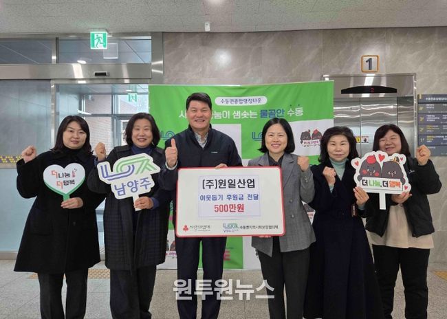 (원투원뉴스) 남양주시는 29일 수동면 소재 ㈜원일산업에서 지역 내 어려운 이웃을 위한 후원금 500만 원을 경기사회복지공동모금회를 통해 수동면 지역사회보장협의체에 지정 기탁했다고 밝혔다.