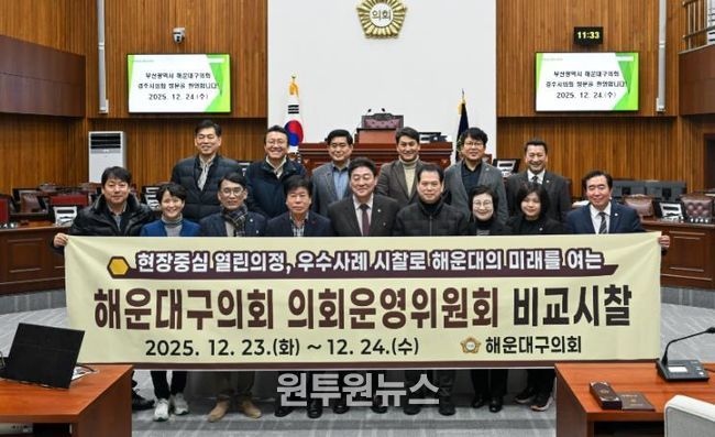 (원투원뉴스) 해운대구의회 의회운영위원회는 지난 12월 23일부터 24일까지 1박 2일간의 일정으로 경주시 일원을 방문해 선진 의회 시설을 비교·분석하고 의정 역량 강화를 위한 벤치마킹을 실시했다.
