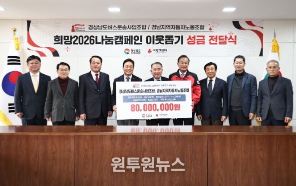 (원투원뉴스) 경상남도는 29일 도청 소회의실에서 경남버스운송사업조합(이사장 양기환)과 경남지역자동차노동조합(위원장 박지훈)이 도내 취약계층을 돕기 위한 성금 8천만 원을 전달했다고 밝혔다.