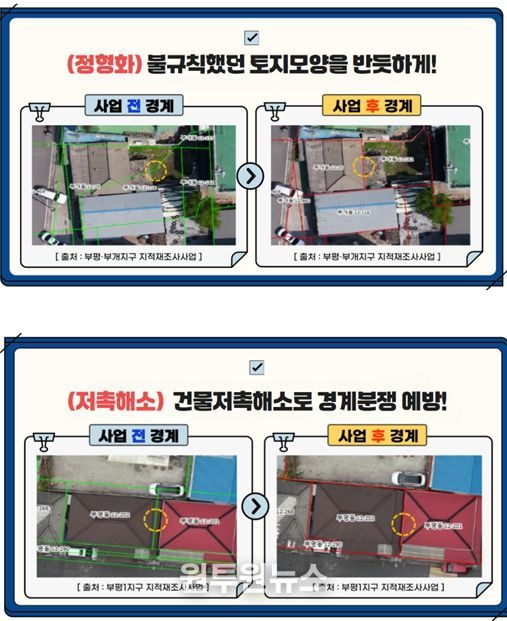 인천시는 ‘지적재조사(바른땅) 시스템’의 공간정보 분석기법을 활용해 지난 2012년 이후 시행된 지적재조사사업의 시행 전·후 지적도면과 각종 주제도를 중첩하여 분석했다.