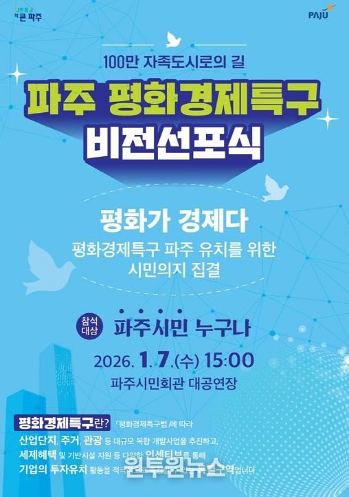 (원투원뉴스) 파주시는 오는 1월 7일 15시, 파주시민회관 대공연장에서 ‘파주 평화경제특구 비전선포식’을 개최한다고 밝혔다.