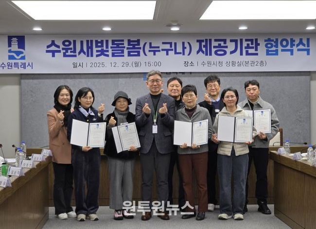 (원투원뉴스) 수원특례시이 29일 시청 상황실에서 ‘수원새빛돌봄(누구나) 서비스 제공기관 재협약 협약식’을 열고, 서비스 제공기관들과 재협약을 체결했다.
