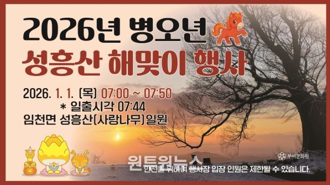 (원투원뉴스) 부여군은 2026년 병오년 새해를 맞아 군민과 관광객이 함께 참여하는 ‘2026 병오년 성흥산 해맞이 행사’를 오는 1월 1일 성흥산(사랑나무) 일원에서 개최한다.