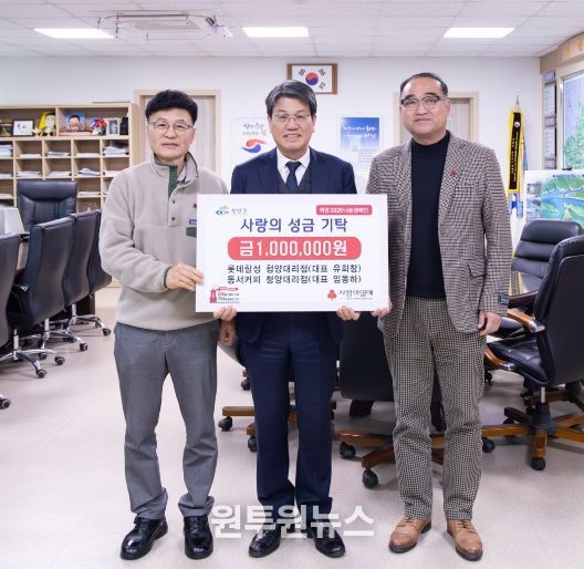 (원투원뉴스) 청양군은 지난 29일 롯데칠성 청양대리점(대표 유희창)과 동서식품 청양대리점(대표 임동하)이 어려운 이웃을 위해 사용해달라며 각 50만 원씩 총 100만 원을 기탁하고, ‘희망2026 나눔캠페인’에 참여했다고 밝혔다.
