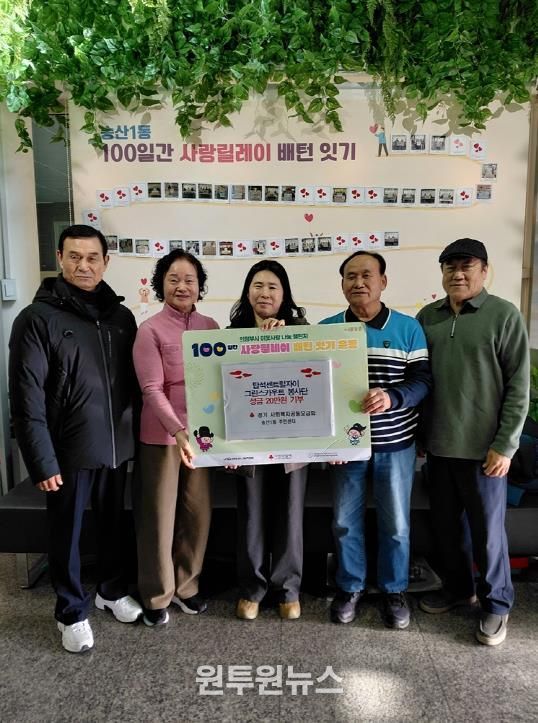 (원투원뉴스) 의정부시 송산1동주민센터는 12월 22일 용현동 소재 탑석자이그린스카우트 봉사단이 ‘100일간 사랑릴레이 배턴 잇기’에 동참해 취약계층을 위한 성금 20만 원을 후원했다고 밝혔다.