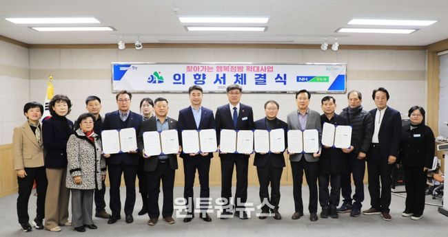 (원투원뉴스) 함양군은 30일, 군청 소회의실에서 ‘찾아가는 행복점빵’ 확산을 위해 농협중앙회 함양군지부와 5개 지역농협이 참여하는 사업 추진 의향서 체결식을 가졌다.