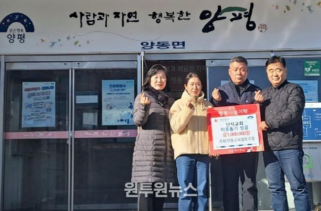 (원투원뉴스) 양평군 양동면은 추운 겨울을 맞아 지역사회의 이웃사랑 실천을 위해 양동면 내 여러 단체가 기부에 동참하고 있다고 밝혔다. 양평부추영농조합법인, 단석교회, 양평중기협회 등 지역 단체들은 어려운 이웃을 위해 사용해 달라며 기부금을 전달했다.