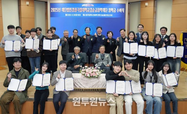 (원투원뉴스) ‘재단법인 경상국립대학교 김순금 장학재단’은 12월 29일 오후 4시 법과대학 ‘김순금홀’에서 2025년 장학금 수여식을 개최했다.